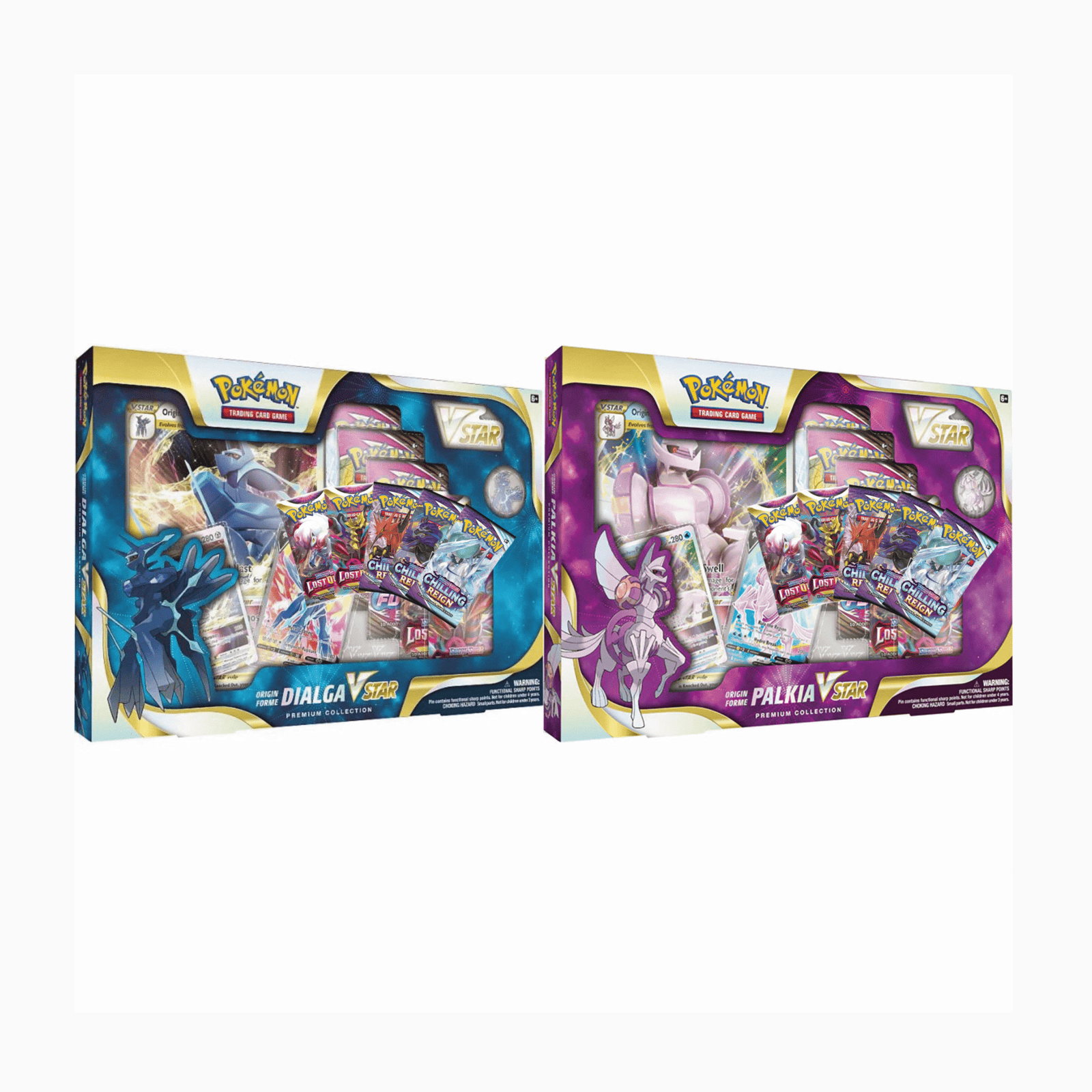 This sealed case includes 6 Premium Collections — 3 Origin Forme Dialga VSTAR and 3 Origin Forme Palkia VSTAR — each packed with exclusive foil cards, collector’s items, and booster packs.